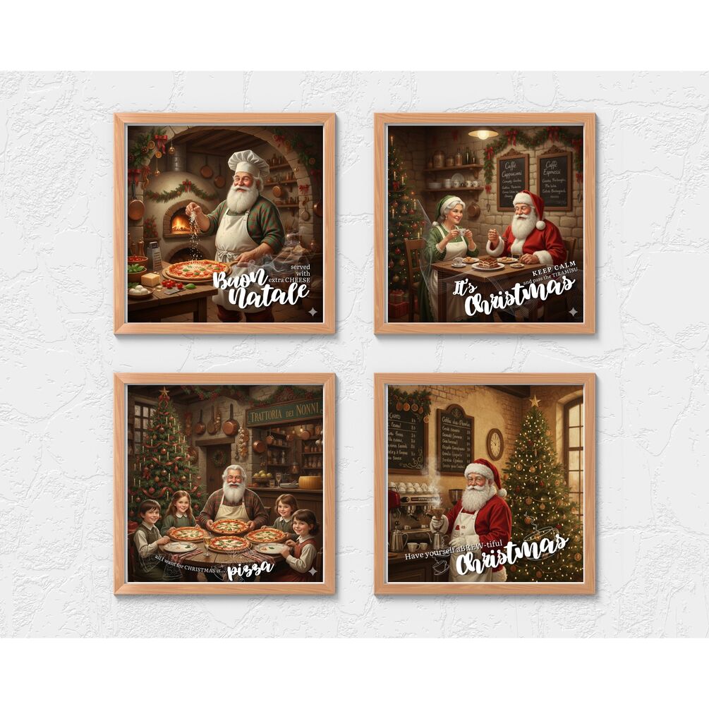 Festive Italian Christmas wall art bundle featuring Santa & Mrs. Claus in cozy café and kitchen scenes. Perfect décor or gift for chefs, bakers, baristas, and restaurants. Includes 5 designs in JPG & PDF.