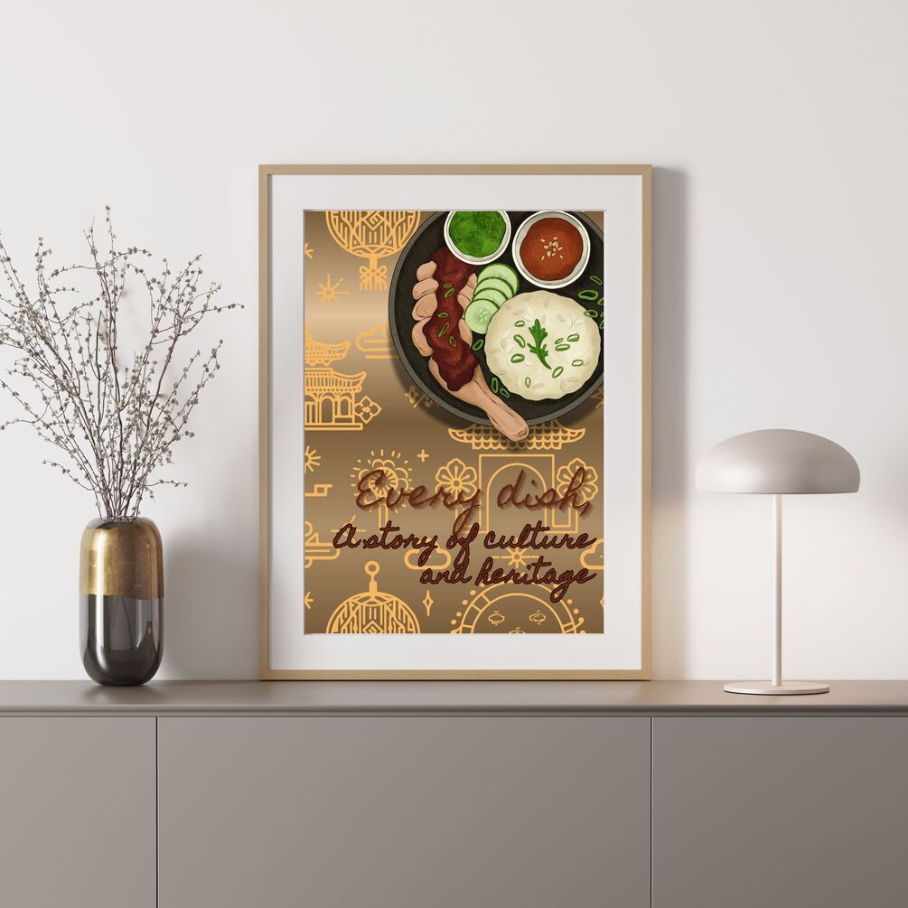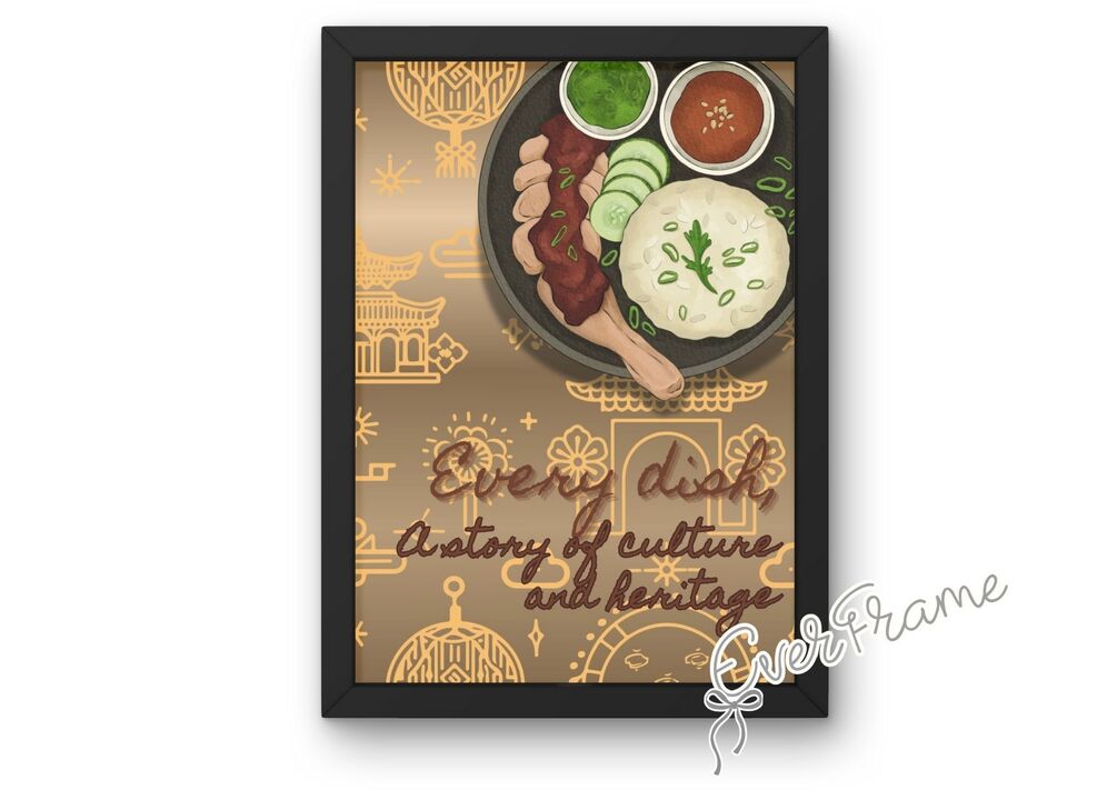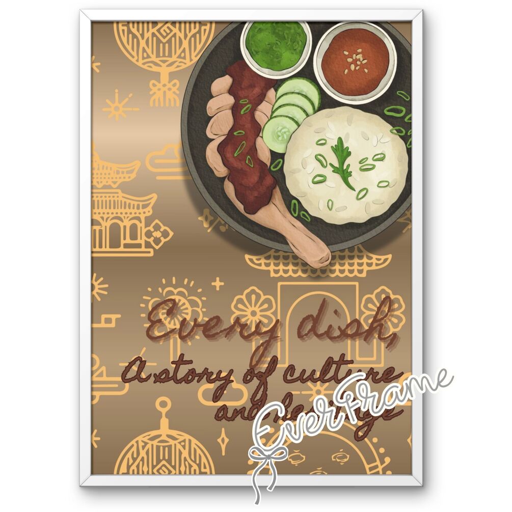 Enhance your Asian kitchen, Chinese restaurant, or food stall ambiance with this elegant digital wall art featuring a classic Chinese meal of roasted duck with rice, garnished with fresh cucumber and traditional sauces. Set against a luxurious gold and brown patterned background, this artwork tells a story of centuries-old culture and culinary heritage.