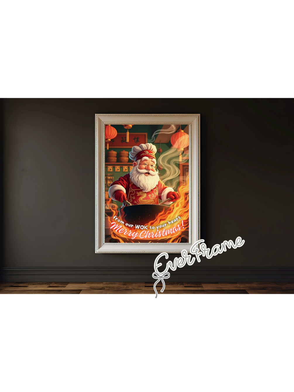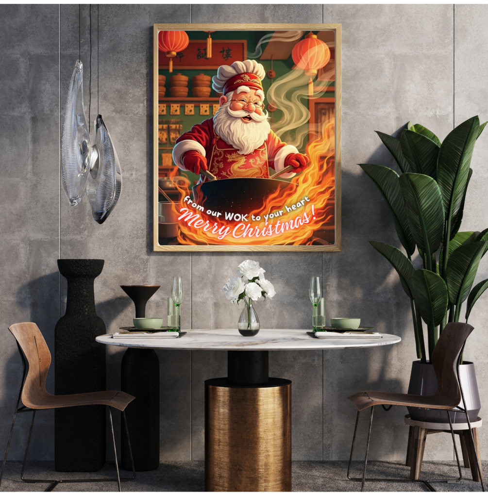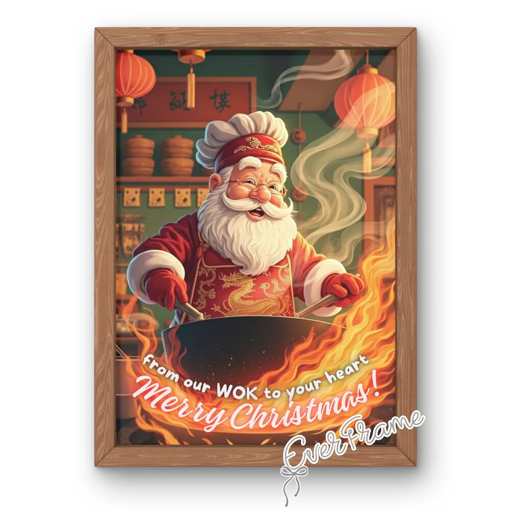 This “Santa’s Wok Christmas” wall art features Santa Claus cooking in a traditional Chinese wok inside a warm, classic Chinese restaurant kitchen — a perfect blend of Christmas cheer and oriental charm.