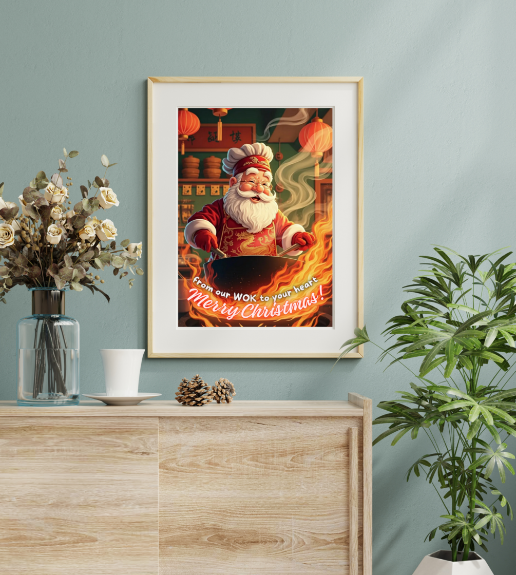 Santa cooking in a wok! Festive Chinese kitchen wall art perfect for restaurants, chefs, and Chinese food lovers this Christmas.