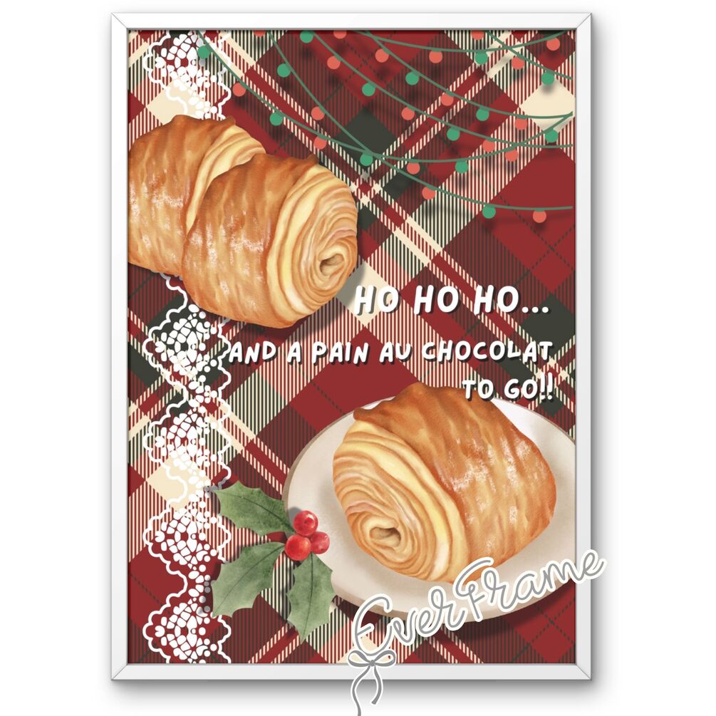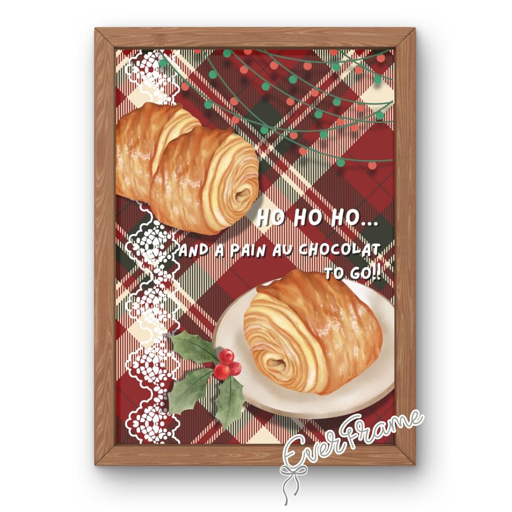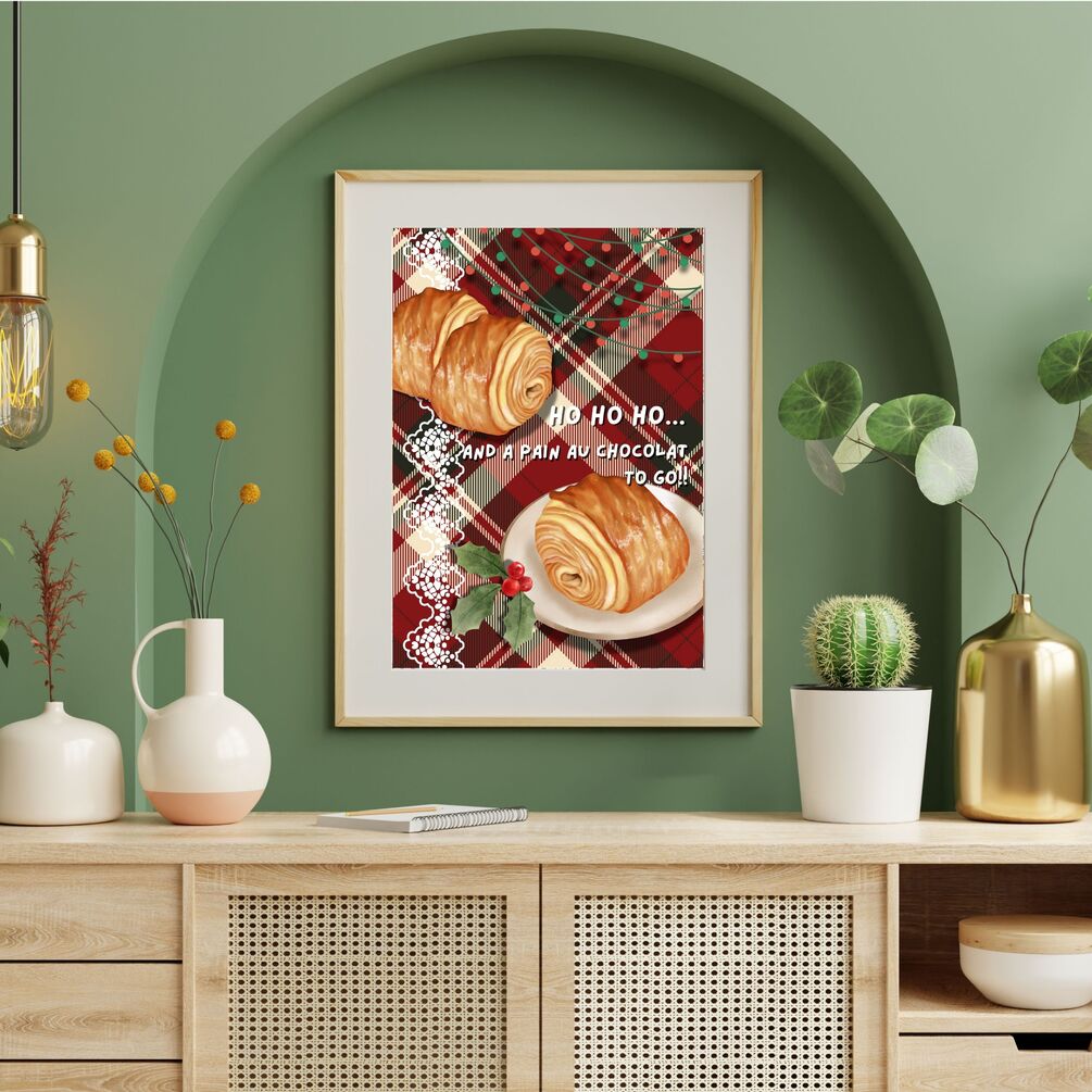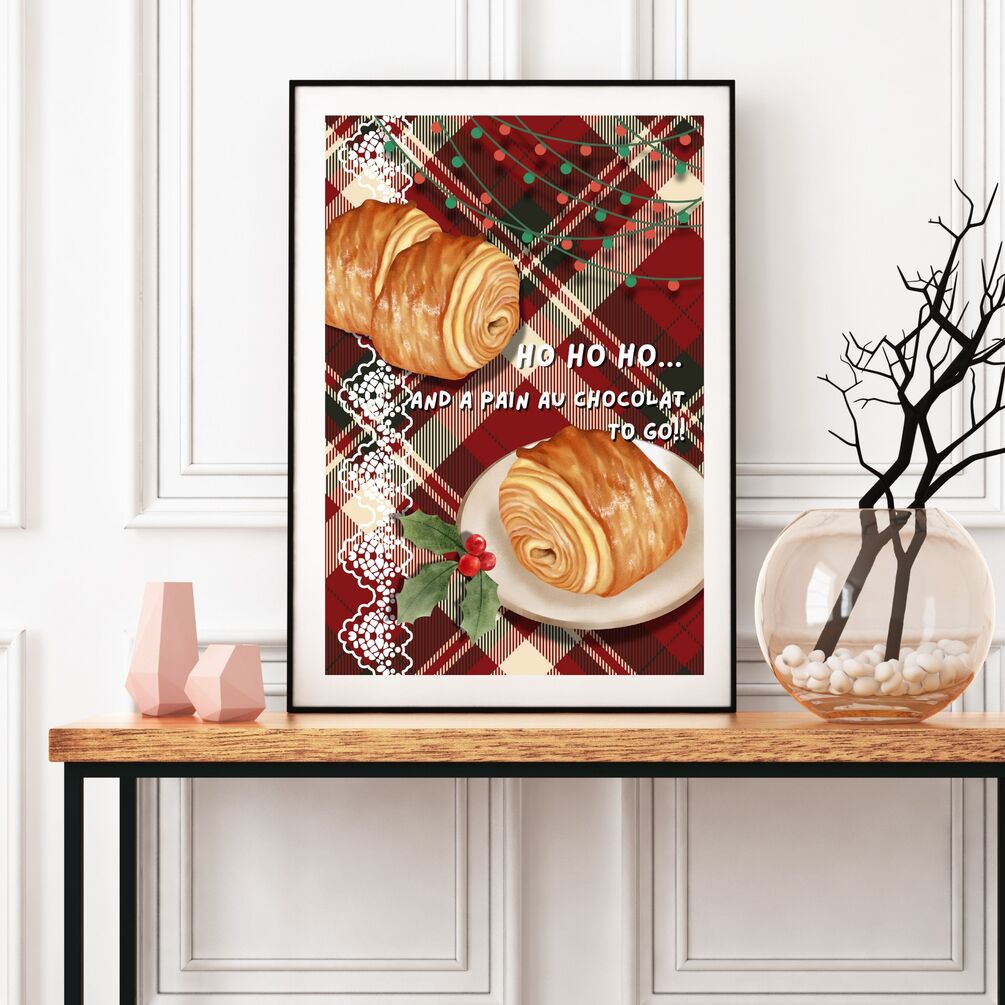 Playful European Christmas wall art featuring a classic pain au chocolat and festive quote — perfect for bakery, café, or restaurant décor. A charming Christmas gift for pastry and coffee lovers.