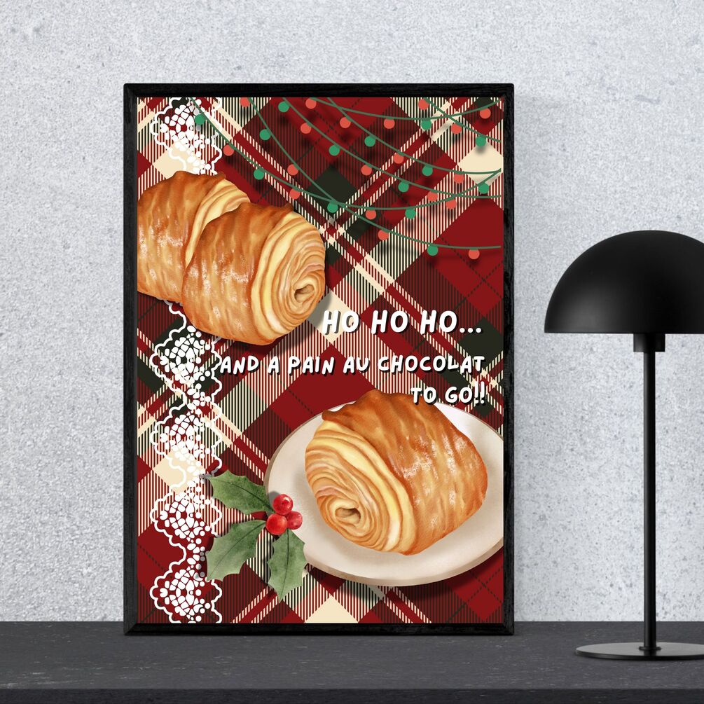 Bring the cozy charm of a European Christmas café into your space with this delightful wall art featuring a golden pain au chocolat and the playful festive quote: