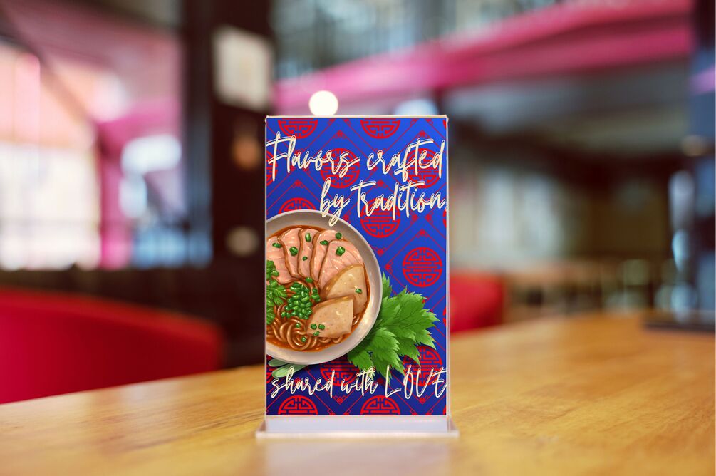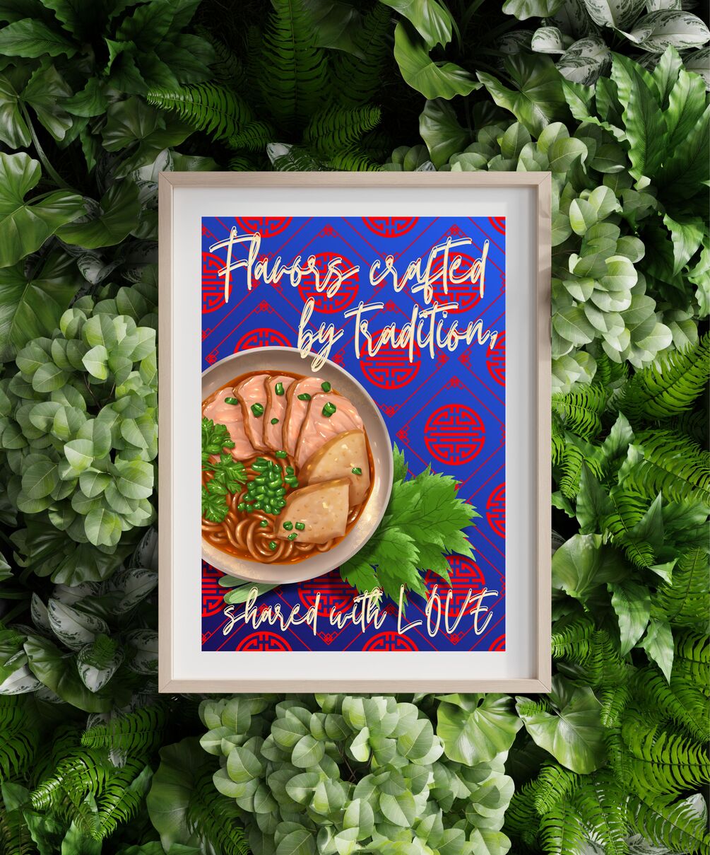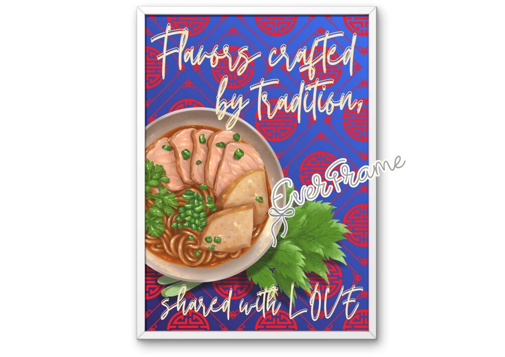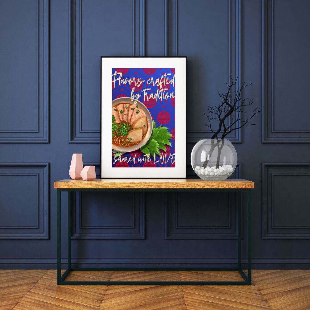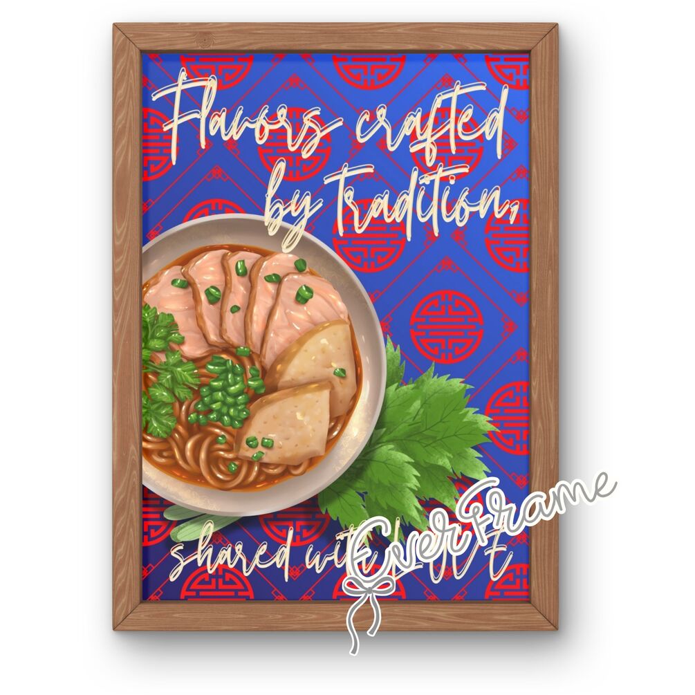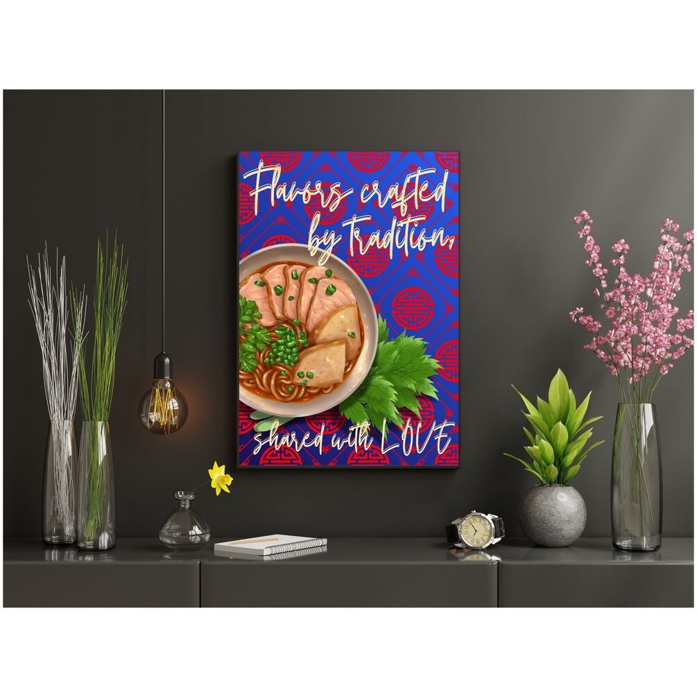 Elevate your Asian kitchen, Chinese restaurant, or food stall décor with this vibrant digital wall art featuring a delicious bowl of traditional Chinese noodles with sliced meat, complemented by fresh herbs on a striking blue and red pattern backdrop. This artwork celebrates the rich tradition and bold flavors crafted through centuries.