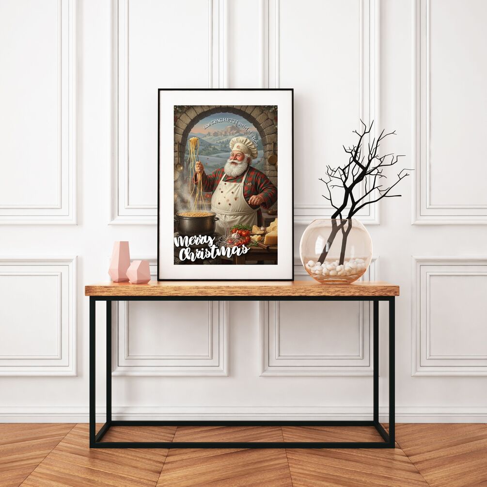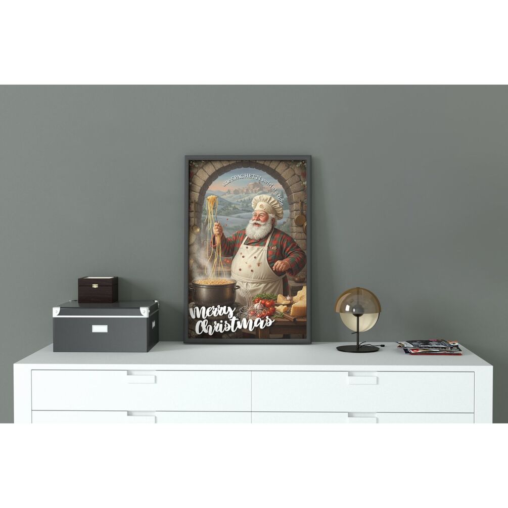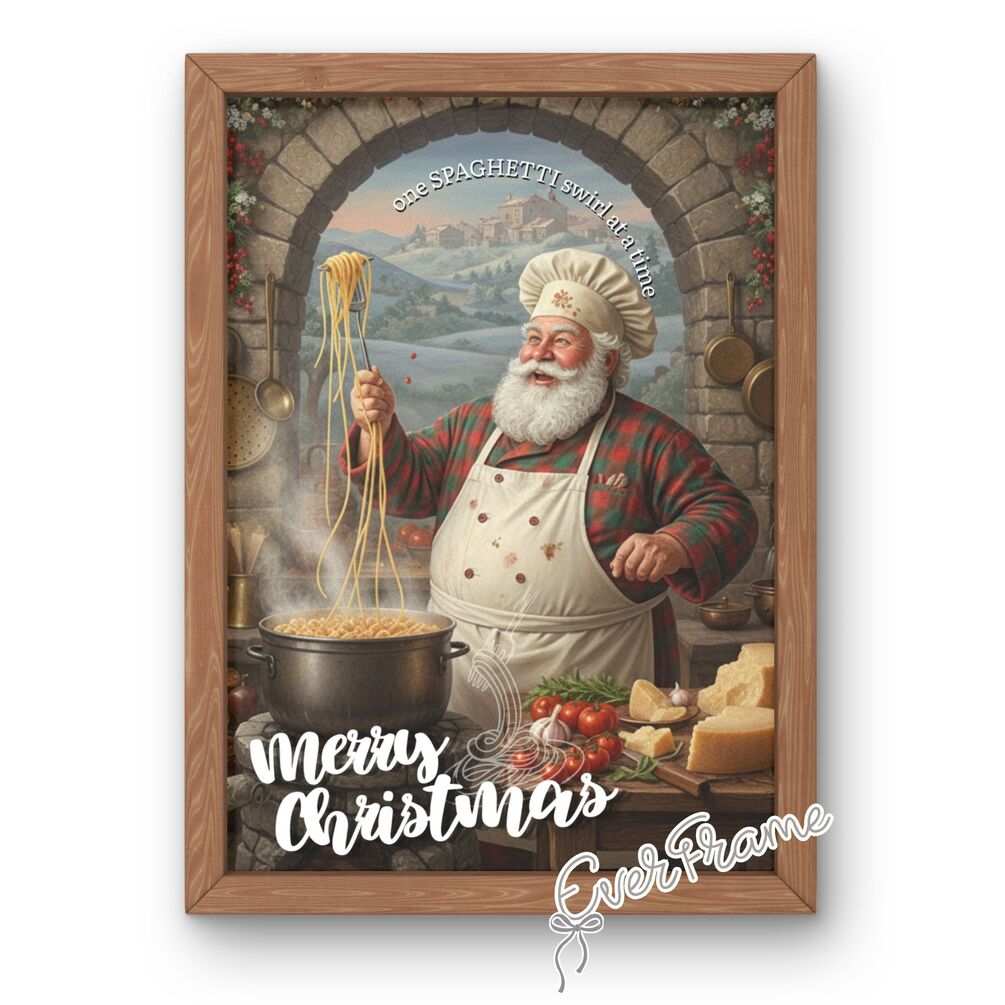 This festive wall art captures Santa Claus cooking pasta in a classic Italian kitchen, swirling spaghetti with joy and love — perfectly paired with the cheerful quote “One Spaghetti Swirl at a Time... Merry Christmas.” 🇮🇹