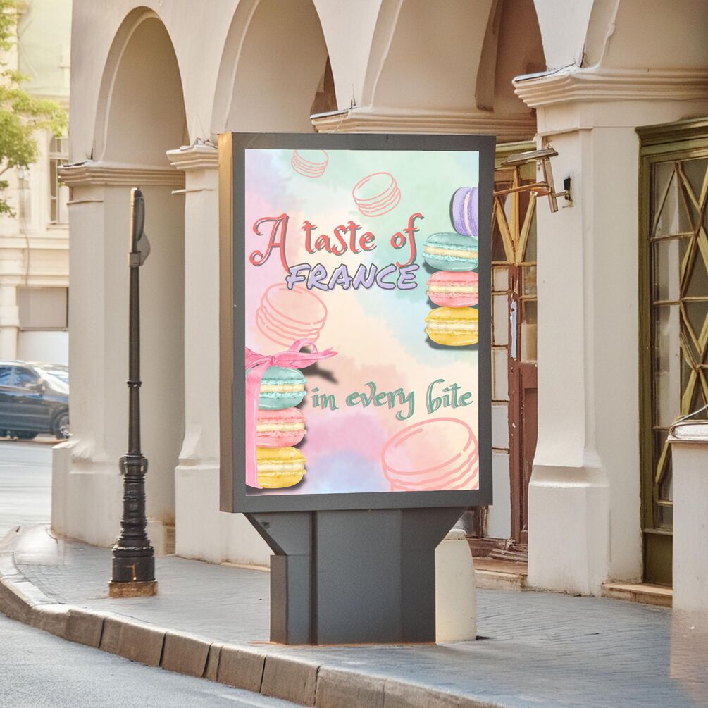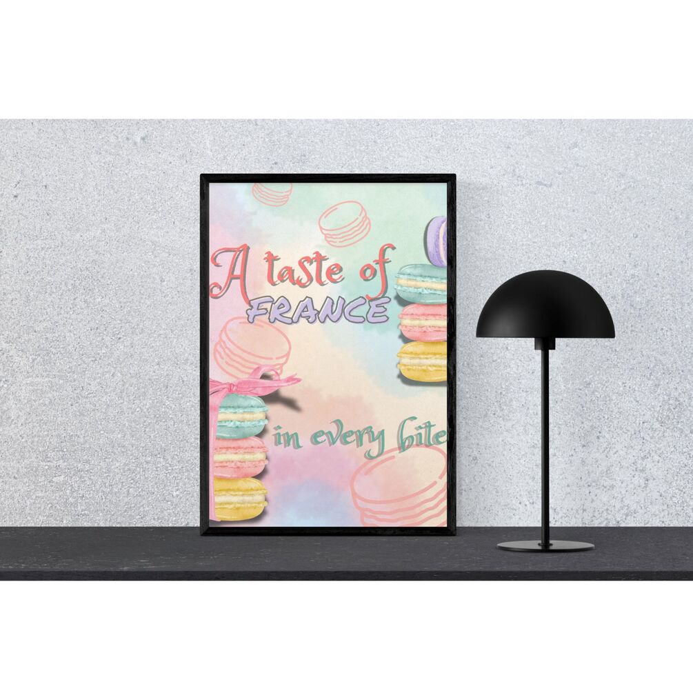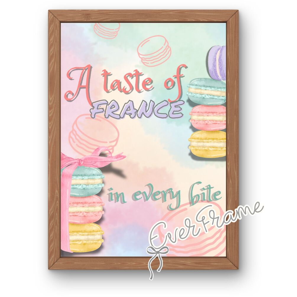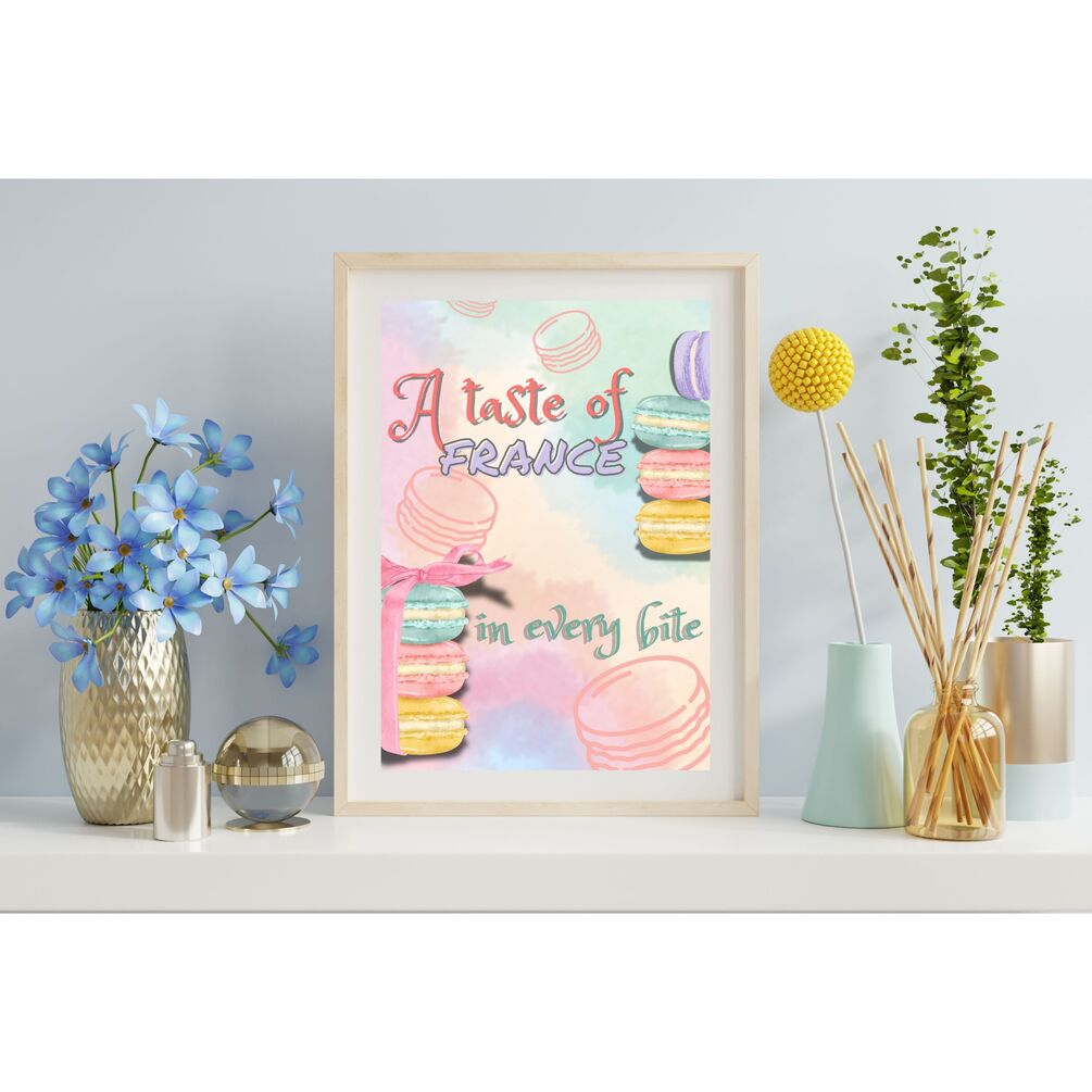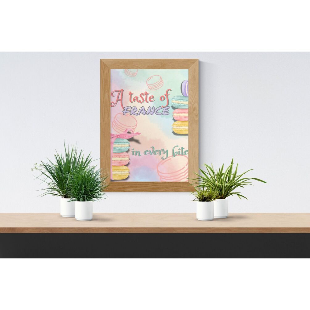 Bring the charm of a Parisian bakery into your space with “A Taste of France” — a beautifully illustrated wall art featuring colorful macarons and elegant pastel tones. Perfect for bakeries, pastry shops, kitchens, cafés, or anyone who adores French desserts.