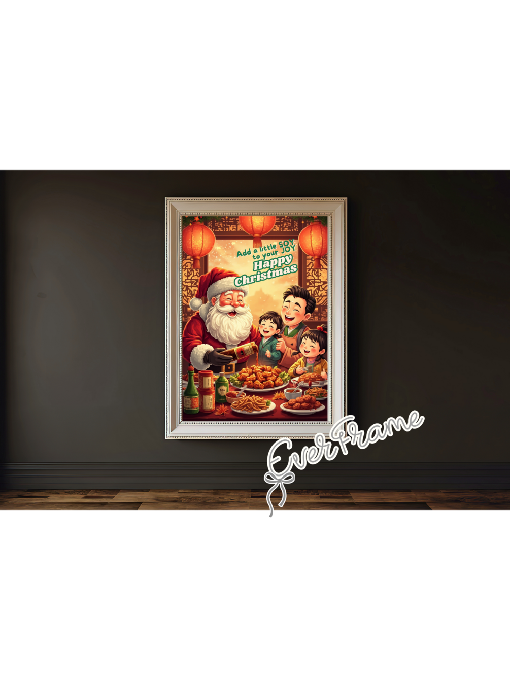 This “Soy & Joy Christmas” wall art features Santa Claus enjoying a warm Chinese feast with a family in a cozy, traditional Chinese restaurant — blending holiday warmth with oriental charm.